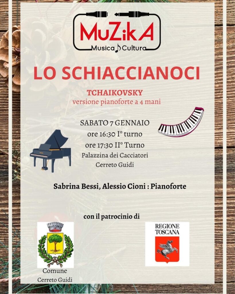 Sabato 7 Gennaio, presso la Palazzina dei Cacciatori in Via Santi Saccenti a Cerreto Guidi, si terrà il bellissimo concerto con l'esecuzione de "Lo Schiaccianoci" di P. I. Tchaikovsky nella versione per pianoforte a quattro mani. Si esibiranno i Maestri Sabrina Bessi e Alessio Cioni, concertisti ben noti nel panorama musicale nazionale ed internazionale.