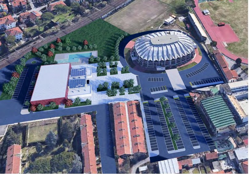 Progetto della nuova piscina. Nello specifico il progetto prevede la costruzione di un centro natatorio posto, per la maggior parte, su un unico piano fuori terra, la porzione centrale del fabbricato presenta due piani fuori terra (zona a doppia altezza per accesso alla zona spettatori e locai tecnologici impianti), una piccola porzione di piano interrato di pertinenza per la manutenzione degli impianti delle piscine. Il fabbricato avrà fronte principale di accesso nella “piazza” di aggregazione, oggetto di altro intervento, progettata tra il nuovo centro natatorio e il palazzetto dello sport esistente, fiancheggiando sul lato nord-ovest la via Atleti Azzurri Pisani. L’ingresso principale si trova al piano terra e presenta un’area foyer reception di smistamento dei flussi, con la presenza di una zona servizi centrale con uffici, e più all’interno, una zona ristoro bar, adiacente alla vetrata della zona vasche, della relativa zona spettatori attesa genitori e della scala e ascensore per l’accesso al piano primo. Sempre a piano terra, si trovano gli uffici dedicati per l’attività del centro natatorio, i servizi igienici per il personale e per il pubblico (accessibili da utenti disabili).
