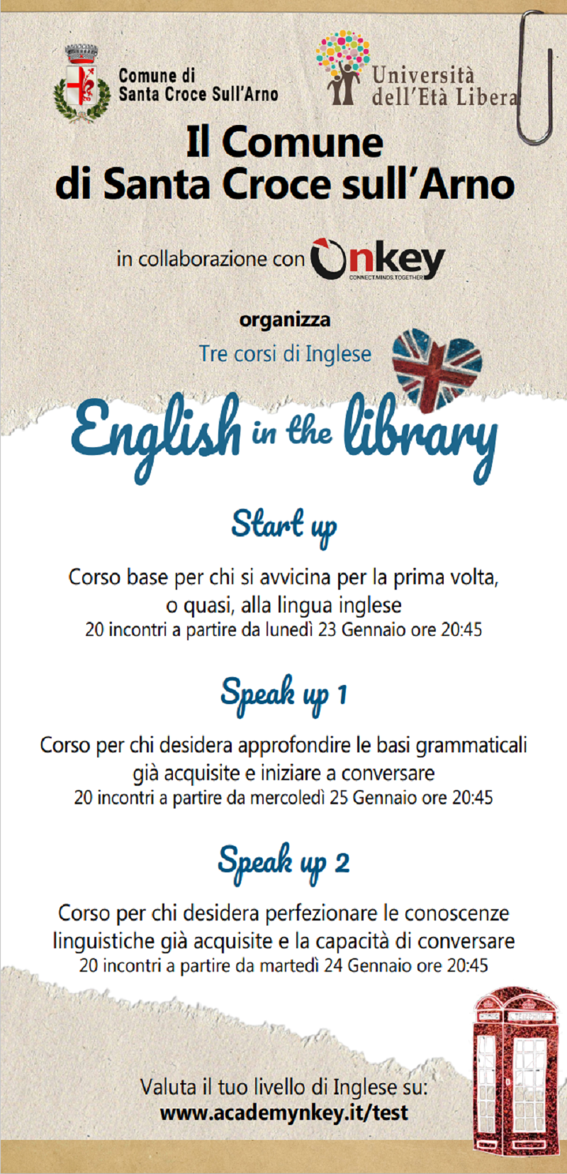 Il calendario degli appuntamenti prenderà avvio lunedì 23 Gennaio 2023, data in cui è programmato l’inizio del primo dei tre corsi di lingua inglese (ognuno dei quali dedicato ad uno specifico livello di conoscenza iniziale della lingua), organizzati in collaborazione con Nkey, società di consulenza informatica e formazione con sede a Santa Croce sull’Arno.