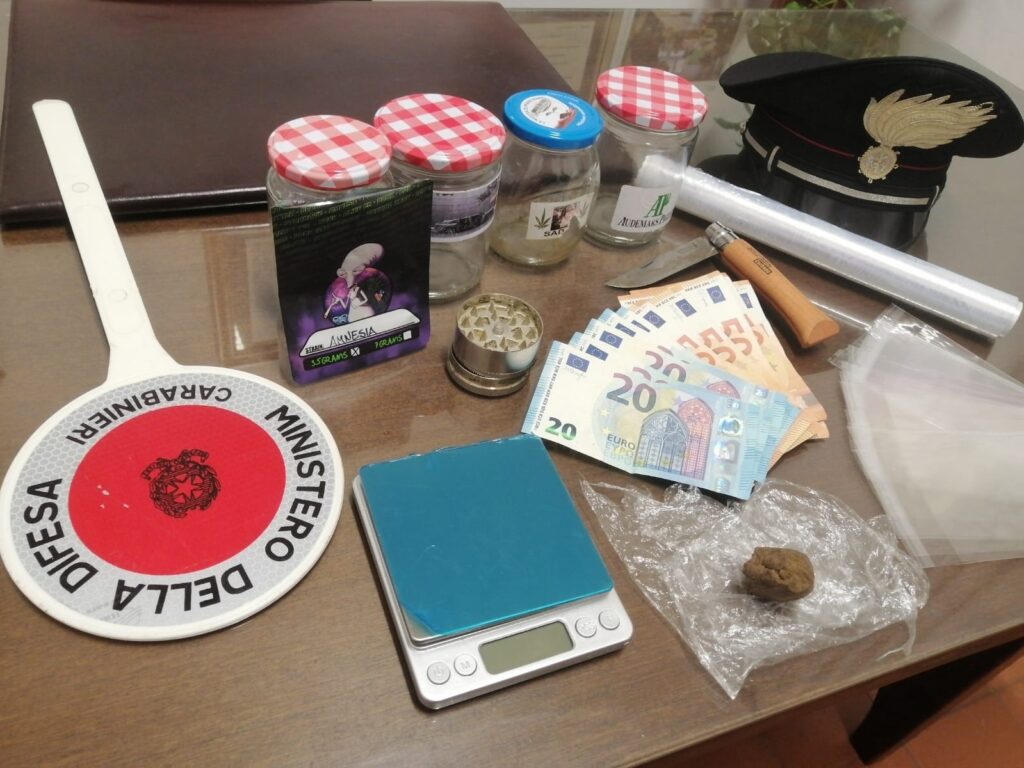 Il ragazzo aveva con sé, occultato negli indumenti , un involucro di cellophane contenente un frammento di circa 15 grammi di hashish. Ritenendo che il giovane potesse avere ulteriore stupefacente, i carabinieri hanno dunque proceduto ad una perquisizione domiciliare presso la sua abitazione, dove, effettivamente, veniva rinvenuto diverso materiale per il confezionamento della sostanza, unitamente alla somma in contanti di 350 euro, ritenuta verosimilmente provento di attività di spaccio.