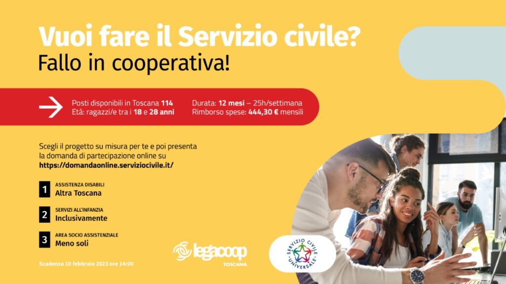 È uscito il nuovo bando per il Servizio Civile Universale. Legacoop Toscana propone 3 progetti nell’ambito del programma “Toscana Inclusiva”, per un totale di 114 posti disponibili distribuiti presso le sedi e le strutture di alcune cooperative sociali toscane.Ciascun progetto prevede azioni che puntano a migliorare, grazie al supporto dei volontari del Servizio Civile Universale, la capacità di inclusione sociale e lavorativa degli ospiti delle sedi in cui il servizio si svolge.