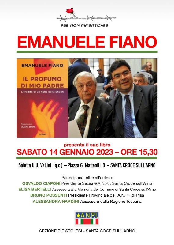 Il libro sarà presentato a Santa Croce sull'Arno sabato 14 gennaio, alle ore 15.30, nella saletta Vallini in piazza Matteotti. Oltre all'autore Emanuele Fiano parteciperanno il presidente della sezione Anpi di Santa Croce Osvaldo Ciaponi, l'assessora alla Memoria Elisa Bertelli, il presidente provinciale Anpi di Pisa Bruno Possenti e l'assessora alla cultura della memoria della Regione Toscana Alessandra Nardini.