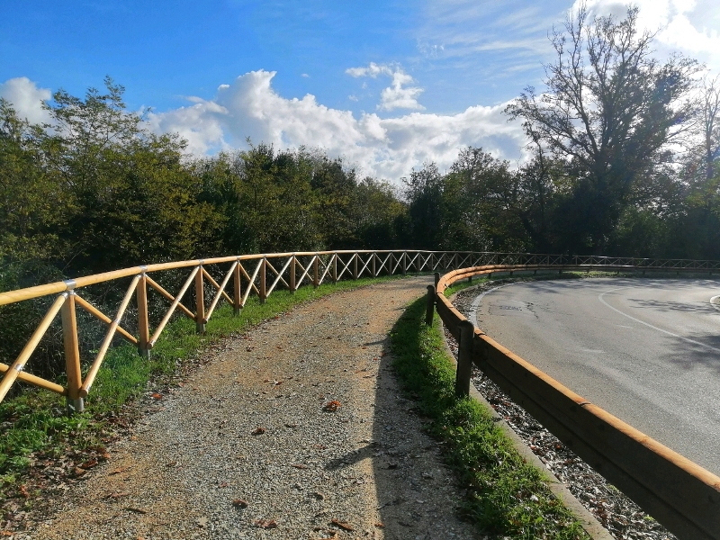 I lavori hanno riguardato più aspetti della sicurezza del camminatore e nello specifico: il consolidamento del fondo calpestabile del percorso con una nuova regimazione delle acque e con la manutenzione della vegetazione che poteva nel tempo creare problemi di sicurezza; il consolidamento e la regolarizzazione morfologica della scarpata e la realizzazione dei drenaggi; la sostituzione della staccionata di protezione del camminamento sul lato della scarpata e la manutenzione della barriera stradale con ripristino della parte in legno deteriorata che separa il tracciato storico da Via comunale di Poggio Adorno. I lavori hanno riguardato anche l’installazione della specifica segnaletica di indicazione della rete escursionistica regionale.