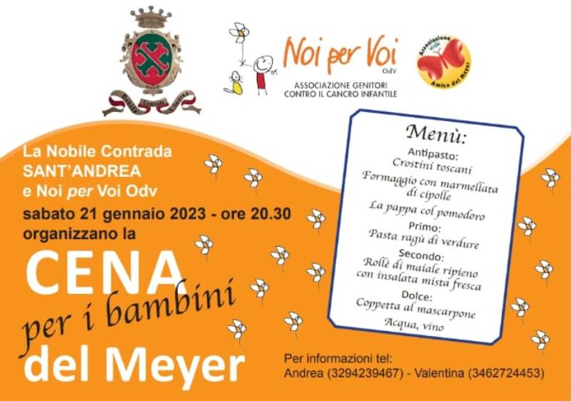 Una cena per stare insieme in solidarietà. L'appuntamento da segnare in agenda è per sabato 21 gennaio, dalle 20.30 presso il Palazzo della Volta a Fucecchio, con la "Cena per i bambini del Meyer". Il ricavato della serata, organizzata dalla contrada Sant'Andrea e da Noi per Voi Odv, andrà a sostegno dei piccoli pazienti e delle loro famiglie.
