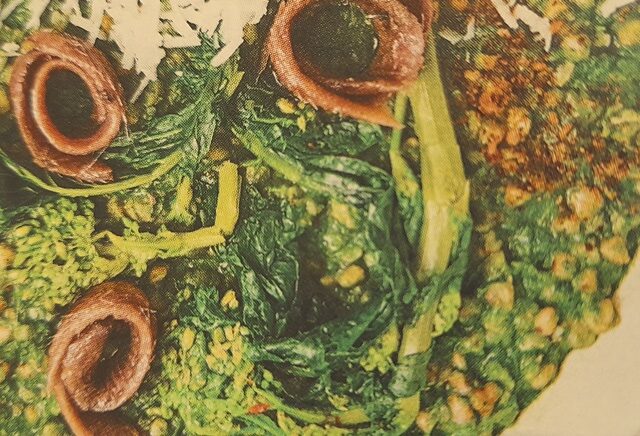 Lavate le cime di rapa e cuocetele in acqua bollente salata per 7 minuti. Passate sotto l’acqua fredda, tenetene da parte qualcuna e frullate il resto, ottenendo una crema. In una padella fate appassire lo scalogno tritato con un filo d’olio. Aggiungete il grano saraceno e fatelo tostare per un minuto, poi sfumate con il vino e lasciatelo evaporare completamente. Versate il brodo gradualmente e portate a cottura per circa 10-15 minuti. Durante gli ultimi minuti unite la crema di cime di rapa e mescolate. Spegnete il fuoco e mantecate con il provolone grattugiato (tenendo da parte due cucchiai) e un filo di olio. Impiattate e decorate con le cime tenute da parte, i filetti di alici, la polvere di pomodoro e il rimanente formaggio grattugiato.
