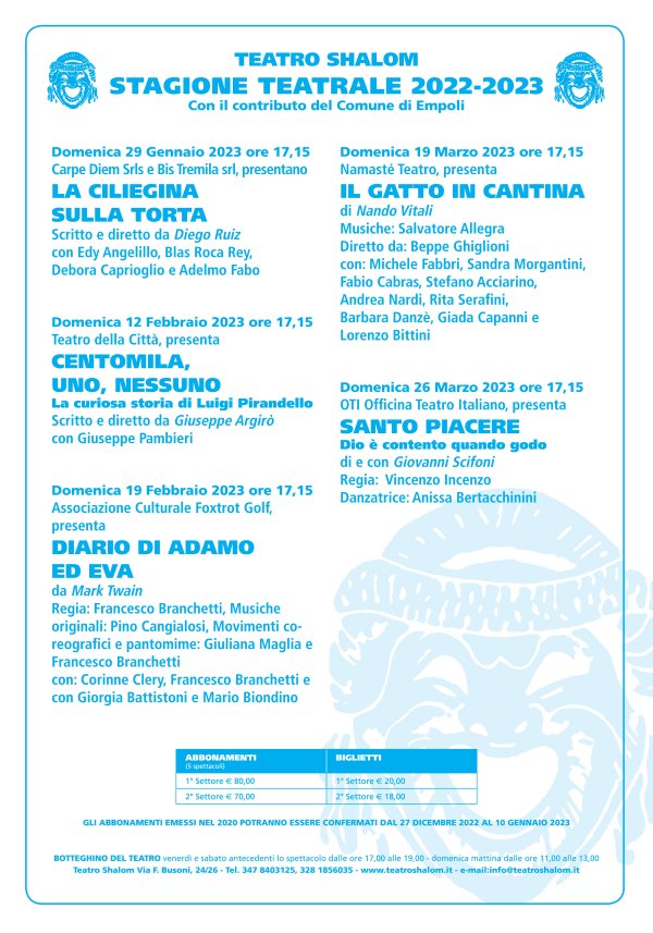Dopo due anni di pandemia (nei quali sono stati comunque tenuti 45 eventi tra spettacoli e concerti) il Teatro Shalom di Empoli torna con la sua rassegna teatrale tra inverno e primavera. Cinque gli spettacoli in rassegna, tutti rodati da compagnie che li hanno portato in giro per l'Italia da anni. Oggi la presentazione.