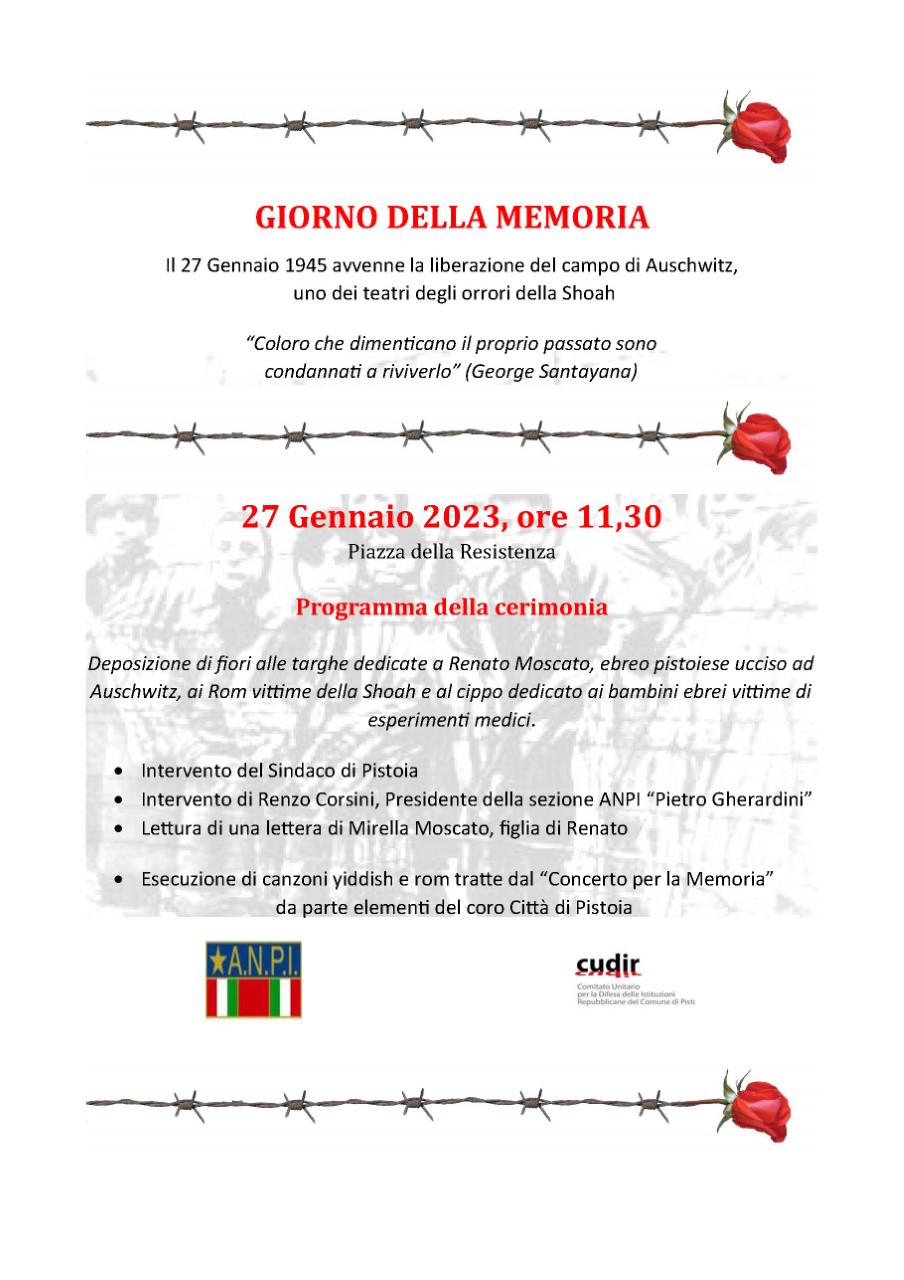 Durante la commemorazione verrà letta una lettera di Mirella Moscato, figlia di Renato, e il Coro Città di Pistoia eseguirà canzoni yiddish e rom tratte dal “Concerto per la Memoria”.