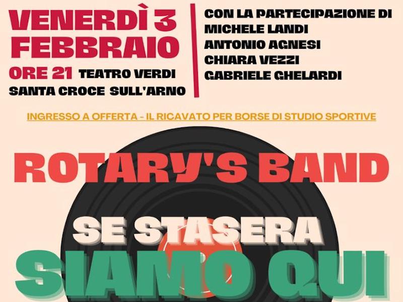 Il presidente ha concluso la serata ricordando ai soci che nella serata di venerdì 3 febbraio al Teatro Verdi, salirà di nuovo sul palco del Verdi la Rotary's Band del Club Santa Croce - Montopoli - Comprensorio del Cuoio che presenterà il suo nuovo spettacolo “Se stasera siamo qui”. Si tratta di una carrellata di canzoni immortali che si alternerà a interventi di “guest stars” della zona, accompagnata da aneddoti, curiosità sui brani in programma e, dalla proiezione di immagini con, spezzoni di video degli interpreti originali. Sarà inoltre presentata la nuova canzone del Carnevale firmata dal concittadino Don Backy, autore di brani strepitosi.
