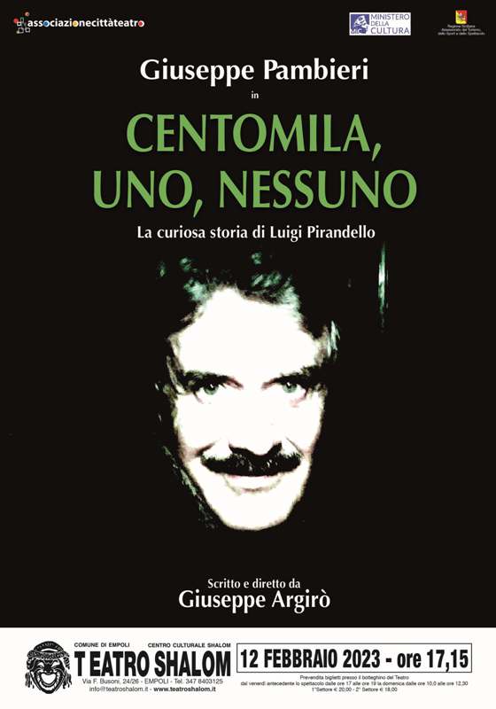 Il 12 febbraio 2023 andrà in scena al Teatro Shalom di Empoli "Centomila, uno, nessuno" La curiosa storia di Luigi Pirandello. Lo spettacolo con Giuseppe Pambieri, è scritto e diretto da Giuseppe Argirò.