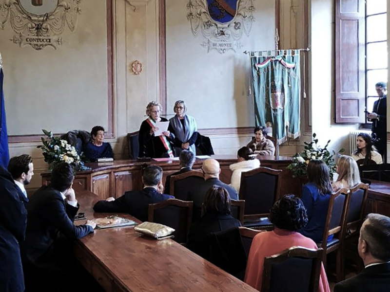 A scambiarsi gli anelli, nella sala del consiglio comunale, l'ex assessore alla cultura del comune di Arezzo e primario di medicina legale dell'ospedale cittadino Pasquale Giuseppe Macrì con la compagna Valentina. La cantante lirica, indossando la fascia tricolore, ha unito i due neo sposi.