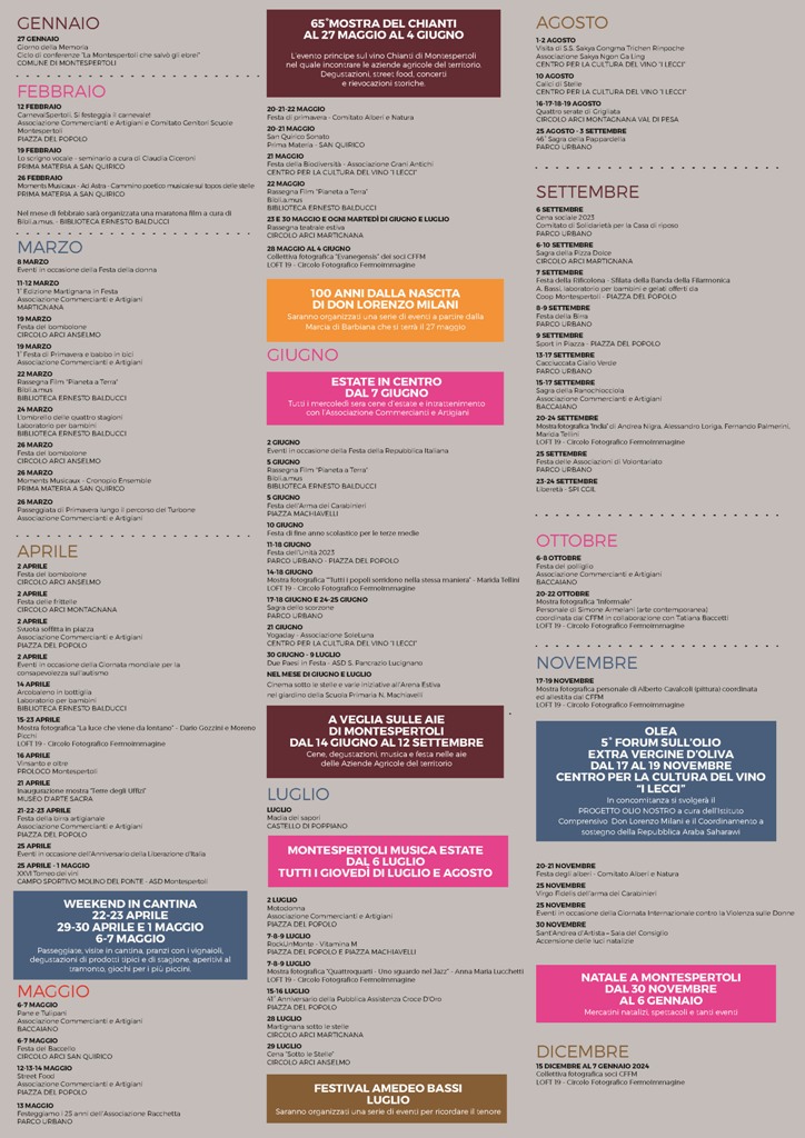 È stato ufficializzato il programma degli eventi che si terranno a Montespertoli nel corso del 2023: spettacoli, festival, mostre, convegni, concerti, sagre, fiere e mercati, manifestazioni sportive, rappresentazioni teatrali e rievocazioni storiche e folcloristiche.