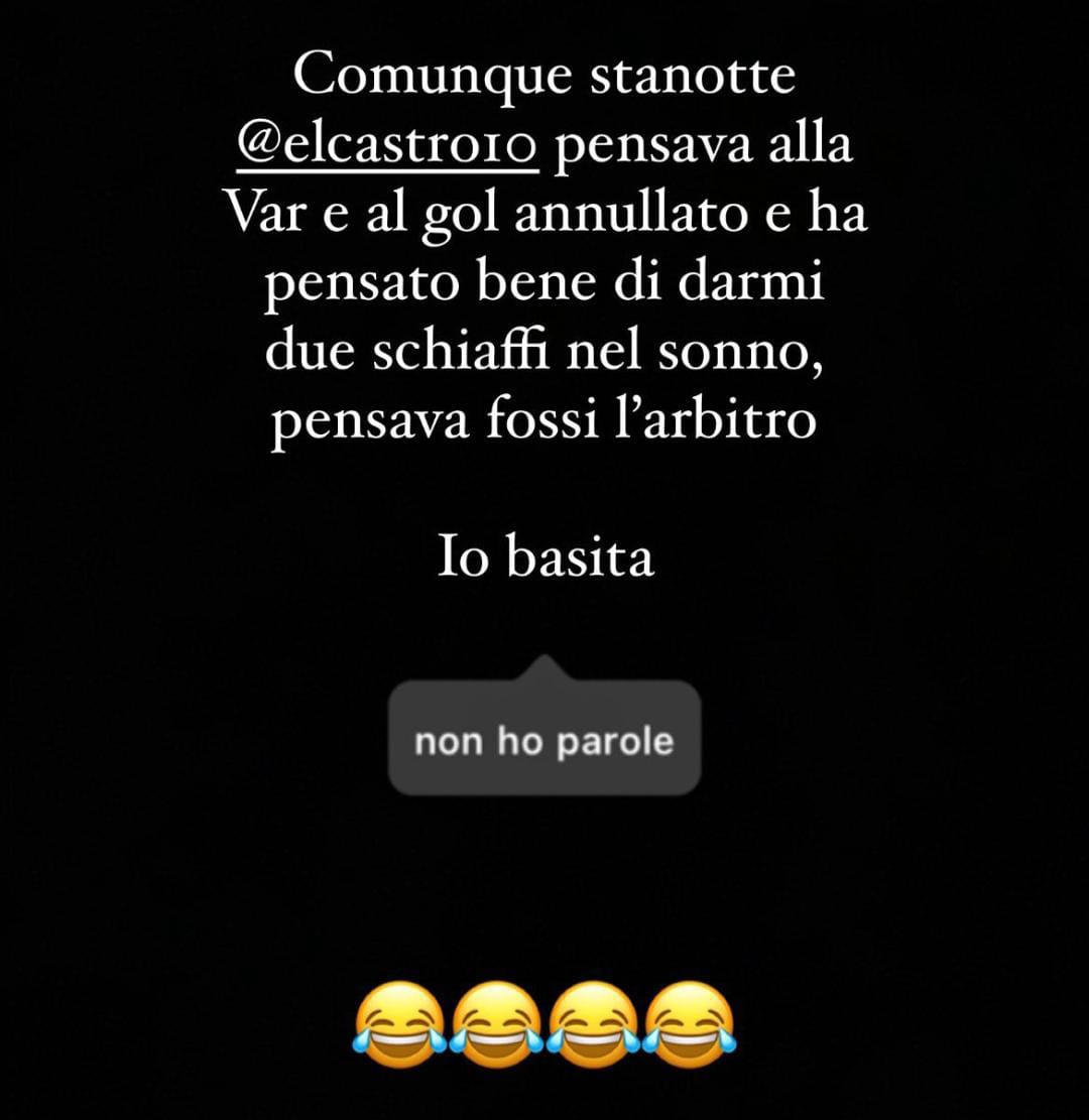 Per il mancato pareggio della Fiorentina contro la Juventus, complice un fuorigioco di un compagno, i sonni del centrocampista viola Gaetano Castrovilli si sono fatti agitati. Tanto da aver dato due schiaffi nel sonno alla moglie Rachele Risaliti, ex Miss Italia. A darne notizia, con toni diveriti, proprio Risaliti su Instagram: "Stanotte Gaetano pensava al Var e al gol annullato e ha pensato bene di darmi due schiaffi nel sonno, pensava fossi l'arbitro, io basita". Ad annullare il gol l'arbitro Fabbri con il supporto del Var, lasciando la vittoria dei bianconeri dopo il gol di Rabiot.