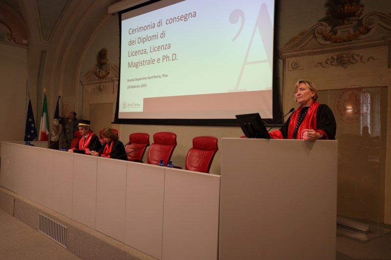 Talento e merito in festa: si è svolta la cerimonia di consegna dei diplomi di Licenza, Licenza magistrale e PhD a circa 150 tra allieve e allievi della Scuola Superiore Sant’Anna che hanno concluso il loro percorso di studio. Non solo un momento per celebrare un prestigioso traguardo, ma anche di consapevolezza per molti giovani studenti, chiamati nel proseguimento del loro percorso formativo e professionale a confrontarsi con le sfide della società presente e futura. "Il talento e il merito sono fondamentali per affrontare le sfide del nostro tempo" ha dichiarato la rettrice Sabina Nuti, che ha introdotto la cerimonia con il discorso di benvenuto. Sono intervenuti anche la prorettrice Arianna Menciassi, la preside della Classe di Scienze Sociali Anna Loretoni, il preside della Classe di Scienze Sociali e Sperimentali Cesare Stefanini e il Rappresentante dei Coordinatori dei corsi di perfezionamento o dottorato di ricerca Fabio Iraldo.