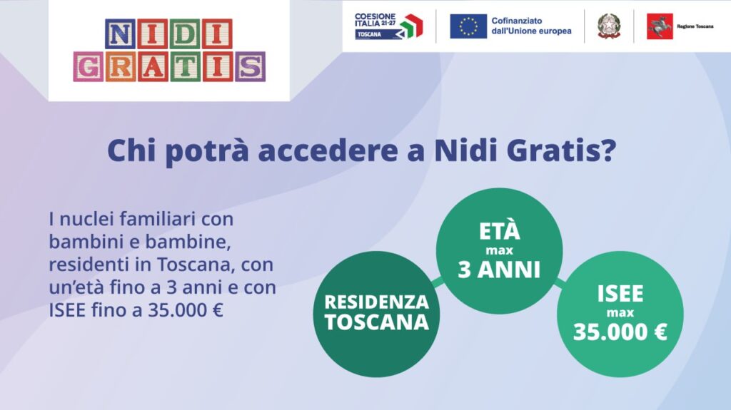 I nuclei familiari con bambini e bambine, residenti in Toscana, con un’età fino a 3 anni e con Isee fino a 35.000 euro. Lo sconto della Regione viene riconosciuto per i nidi ma anche per Spazi gioco e Servizi educativi in contesto familiare.