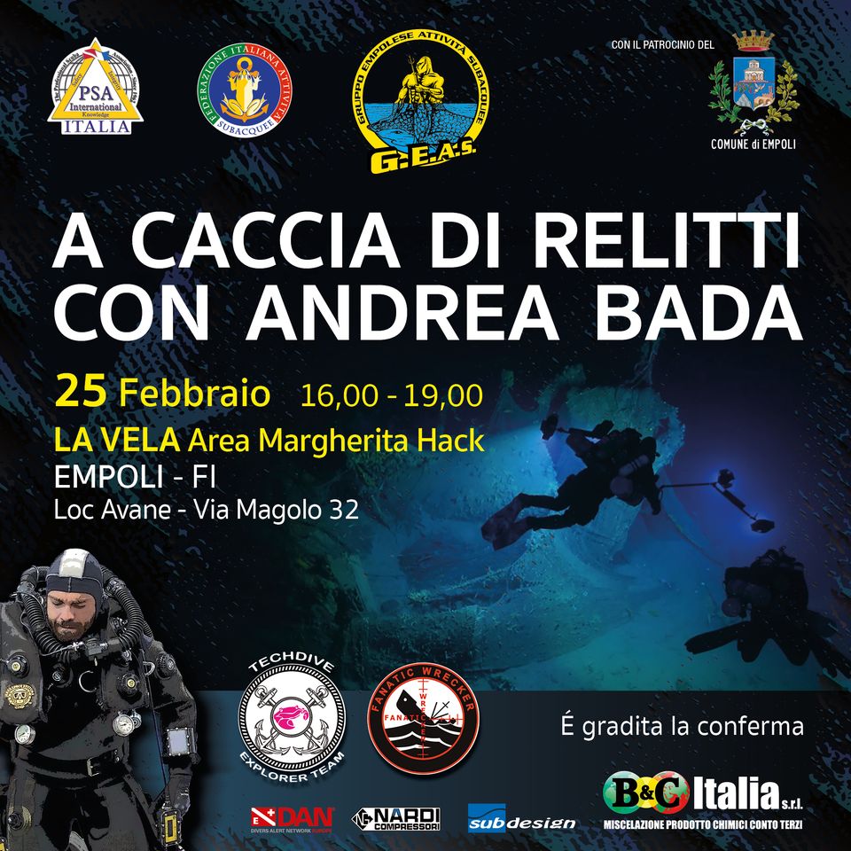 Per farlo ha chiamato la persona forse più adatta per guidare i presenti in questo affascinante mondo. Andrea Bada, sub di origini torinesi che vive in Liguria e gestisce un diving ad Arenzano, è infatti famoso non solo per esplorare e fare video sui relitti ma anche per scoprirli.