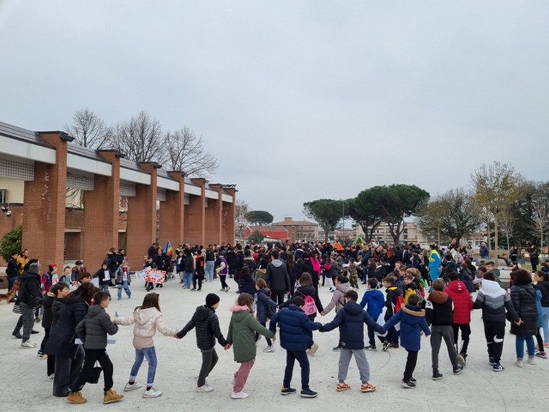 Tutti insieme per dire no alla guerra. Ad un anno dallo scoppio del conflitto in Ucraina, il Comune di Montemurlo ha promosso questa mattina, 24 febbraio, una manifestazione ribadire la contrarietà della comunità montemurlese alla guerra come modalità per risolvere le controversie. A scendere in piazza sono stati gli studenti dell'istituto comprensivo “Margherita Hack” e della scuola paritaria “Ancelle del Sacro cuore” e i rappresentanti di alcune associazioni del territorio. In piazza della Libertà i bambini e i ragazzi hanno portato bandiere arcobaleno, striscioni , poesie e pensieri di pace.