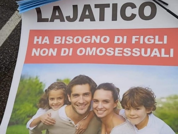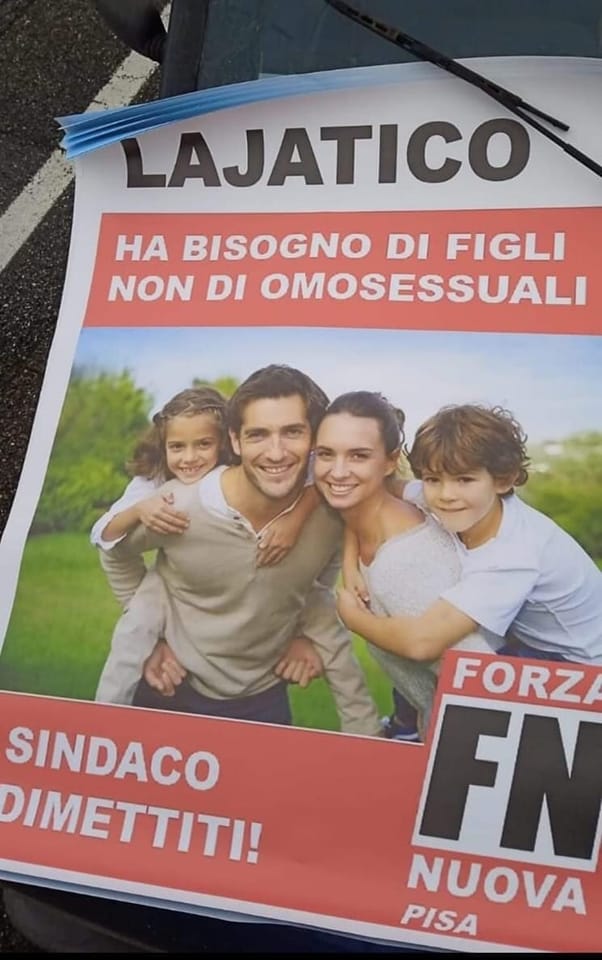 "Lajatico ha bisogno di figli, non di omosessuali. Sindaco dimettiti". Questo volantino firmato Forza Nuova è apparso per le strade del borgo dell'Alta Valdera nella giornata di oggi, suscitando lo sdegno da parte della comunità per il messaggio e la divulgazione tramite volantino. Il volantino farebbe riferimento alla vicenda dell'annullamento della prima classe delle scuole medie per il prossimo anno scolastico.