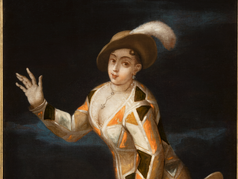Opera di autore ignoto della metà del Settecento, il quadro raffigura la maschera di Arlecchino impersonata da una donna. Proprio questa variante al femminile ha sollecitato una serie di ricerche volte a rintracciare nella pittura di quel tempo altre rappresentazioni con quella caratteristica.