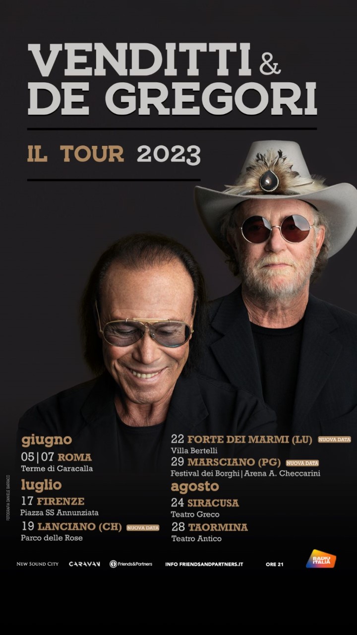Dopo il successo di pubblico e di critica ottenuto allo Stadio Olimpico di Roma (il 18 giugno dello scorso anno), e dopo il tutto esaurito della tournée estiva 2022 nelle più importanti location all’aperto d’Italia (tra cui tre date all’Arena di Verona) e del tour nei principali teatri italiani appena conclusosi, si aggiungono tre nuove date all’atteso tour estivo 2023 di VENDITTI & DE GREGORI.