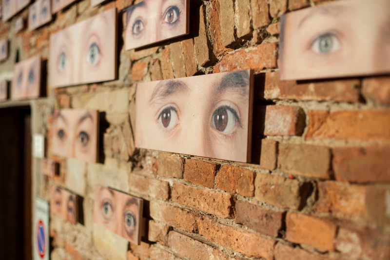 A Peccioli, su una terrazza che guarda la vallata, una parete provata dal tempo è punteggiata da fotografie che ritraggono occhi. Azzurri, grigi, giovani, saggi, brillanti, allegri, astuti, malinconici, provati, speranzosi, gli occhi degli abitanti di Peccioli sono stati fotografati su uno sfondo neutro e sempre uguale: una moltitudine di sguardi che si rivolgono idealmente al futuro, consapevoli di essere parte di una comunità che crescendo sa trasformarsi, accogliendo il nuovo e mantenendo la forza delle proprie radici.