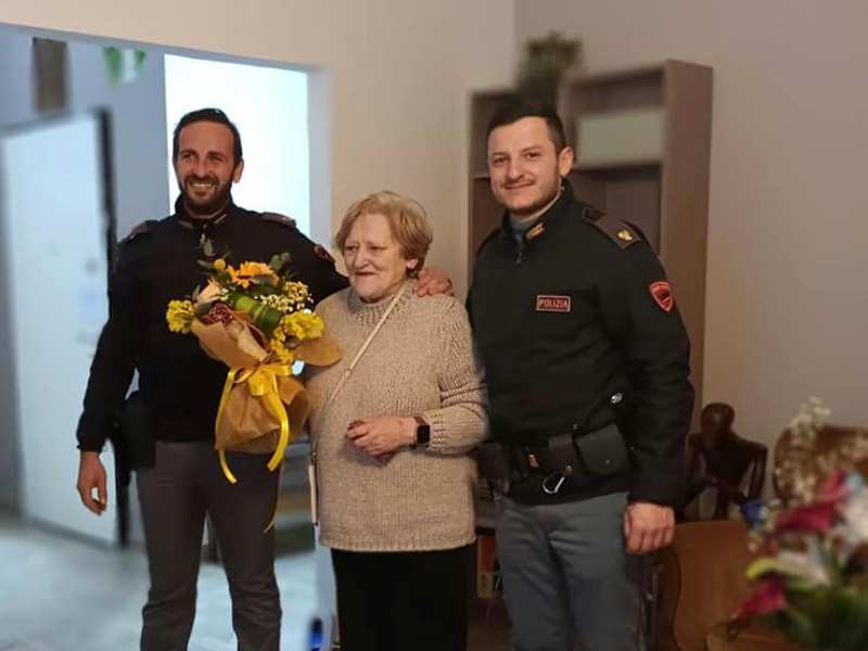 Un mazzo di fiori e gli auguri per la festa della donna: i due agenti sono tornati a far visita alla signora Virginia, 80 anni, e alla sua canina che abbaiando contribuì alla richiesta d'aiuto