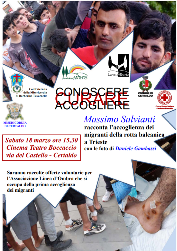 Si chiama “Conoscere, curare e accogliere” lo spettacolo in programma sabato 18 marzo alle 15:30 al Cinema Multisala Boccaccio di Certaldo, organizzato dall’Associazione Anthos in collaborazione con la Confraternita della Misericordia di Barberino Tavarnelle, la Misericordia di Certaldo, Lorem Alberto, il Comitato Croce Rossa Italiana di Certaldo e il Comune di Certaldo. Tre parole che ben descrivono lo spirito con cui nasce e si sviluppa l’iniziativa. Il pomeriggio, infatti, curato dall’attore Massimo Salvianti, ha un duplice obiettivo: drammatizzare la situazione dei migranti sulla rotta balcanica e raccontare la profonda responsabilità umana di Linea d'Ombra, organizzazione triestina che accoglie e si prende cura dei migranti che si fermano a Trieste per partire alla ricerca di un mondo migliore di quello che hanno vissuto e sofferto nel loro luogo di nascita.