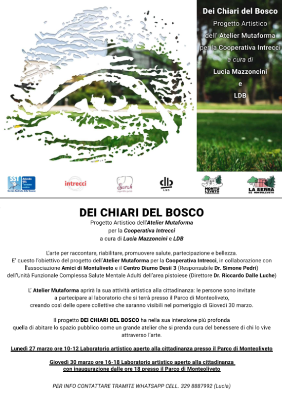 Il progetto “Dei Chiari del Bosco” aprirà la sua attività con due appuntamenti: lunedì 27 marzo, dalle ore 10 alle 12, con un Laboratorio artistico aperto alla cittadinanza nel parco di Monteoliveto (Pistoia); giovedì 30 marzo dall ore 16 alle 18, con un secondo Laboratorio e alle ore 18, sempre a Monteoliveto, l’inaugurazione delle opere collettive che saranno collocate nel parco, in una mostra temporanea all’aperto.