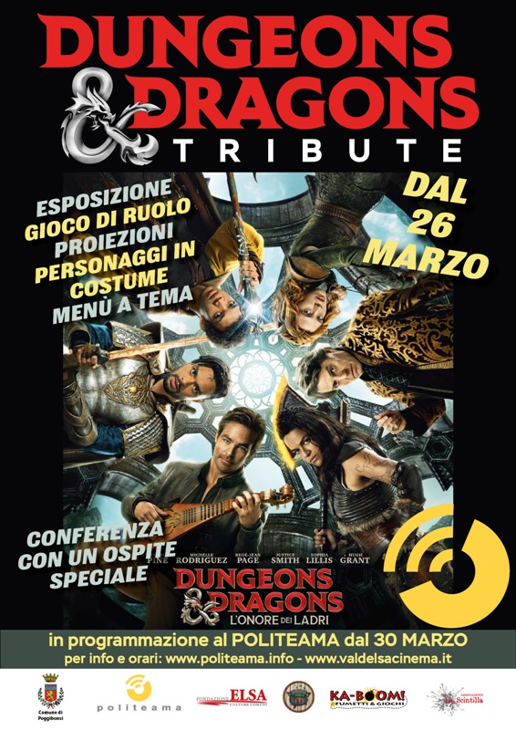 Sta per arrivare nelle sale il film Dungeons & Dragons: l’onore dei ladri e, al polo fantasy del Politeama di Poggibonsi (Si), è tempo di un nuovo Tribute, stavolta dedicato proprio al mondo di Dungeons & Dragons. Un tuffo nel fantasy con ospiti speciali, personaggi in costume, una mostra, cibo e cocktail a tema. Tra gli ospiti Zoosparkle, Roberto Recchioni e Emiliano Pagani, i doppiatori italiani di Vox Machina, Etherea GRV, i rapaci di F.C. Falconeria. Tutti i giorni presso il Passaporta Fantasy Food & Beer si possono gustare cibi e bevande a tema come il panino “Tiro salvezza”, ispirato al celebre tiro di dado dei giochi di ruolo.
