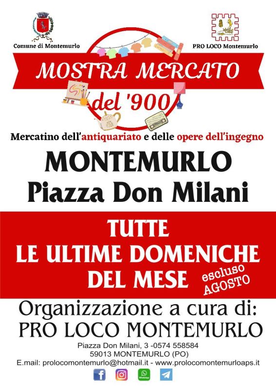 Domenica 26 marzo, per l'intera giornata, piazza Don Milani ospiterà "Novecento", la mostra mercato dedicata all'antiquariato ma anche agli hobbisti e ai prodotti dell'ingegno. Sono trenta gli espositori che per tutta la giornata, dalle ore 9 alle 19, animeranno la piazza, proponendo oggetti insoliti e ricercati. Un vero e proprio viaggio nel tempo. Dallo scorso anno il Comune ha affidato la gestione della mostra mercato alla Pro-loco Montemurlo. Sul sito dell'associazione www.prolocomontemurloaps.it è possibile trovare tutte le informazioni e i moduli per partecipare come espositori telefono 0574 558584 email prolocomontemurlo@hotmail.it L'appello alla partecipazione come espositori è rivolto a tutti gli hobbisti non professionisti, ai collezionisti, a coloro che vendono oggetti di antiquariato e modernariato, ma anche a chi si diletta nella produzione di opere d'artigianato e dell'ingegno.