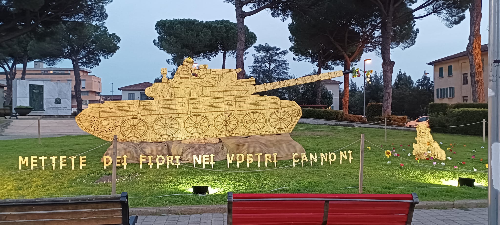 L’associazione “Territorio in comune” ha voluto lanciare un messaggio di speranza e di pace collocando a Ponte a Egola di San Miniato in piazza Spalletti Stellato ’immagine di un carro armato dal cui cannone fuoriescono non proiettili ma fiori accanto ad una bambina che le raccoglie in segno di pace e speranza,