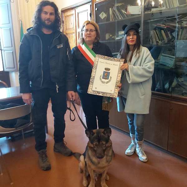 Marley con i padroni e la sindaca Ilaria Parrella, ricevuto in comune a Santa Maria a Monte (foto da facebook)