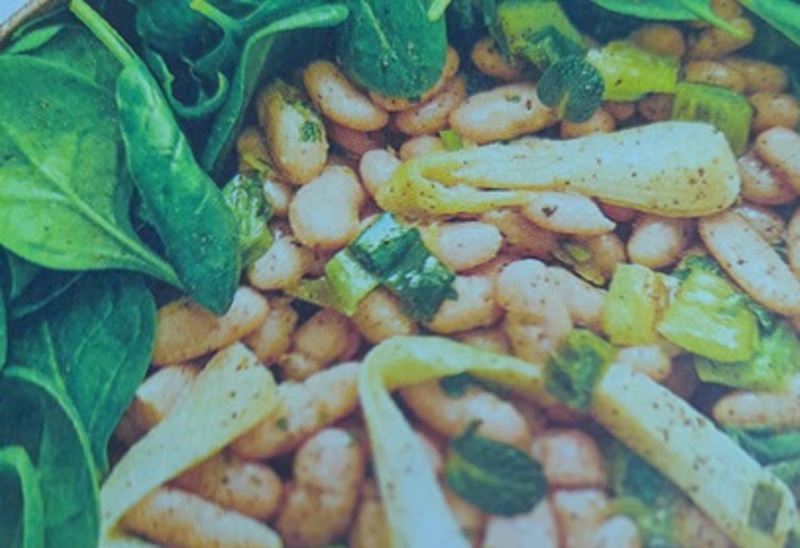 Lavate e tagliate in 4 spicchi il bulbo dei cipollotti e a rondelle le code. Fateli arrostire in una padella con un filo di olio e il sale per 3-4 minuti. Tritate finemente la menta e il prezzemolo e grattugiate la buccia di limone. Emulsionate gli ingredienti della vinaigrette in una ciotola, lasciate l’aglio intero per dare sapore. Condite i fagioli con qualche cucchiaio della vinaigrette. Disponete gli spinaci nel piatto, al centro i fagioli e sopra i cipollotti. Servite con la vinaigrette e della pita.