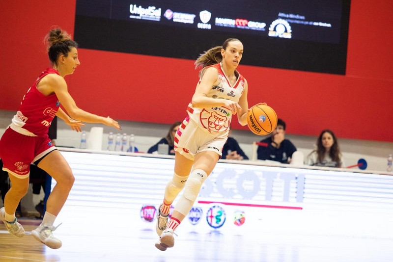 Il mazzo di fiori che la società le consegna prima della gara è l’emozione più bella dell’inizio di una partita nella quale l’Use Rosa da una sensazione di grande solidità. Pur senza alzare mai i ritmi, la squadra di Alessio Cioni morde in difesa e, col passare dei minuti, macina l’ennesimo avversario, peraltro uno dei pochi che all’andata l’aveva battuta. E’ una gara che parte piano e che vede l’Use Rosa provare ad allungare con Stoichkova, Ruffini e Manetti (10-6), prima che Granzotto regali un assist no look come raramente se ne vedono sui campi da gioco: applausi. C’è Dell’Olio particolarmente ispirata ed è lei a firmare il 24-8 prima che Peresson regali sulla sirena una delle sue perle per il 16-8 al 10’. In avvio di seconda frazione una scarica di triple si abbatte su Selargius da Peresson, Stoichkova e Patanè tanto che si arriva su un comodo più 15 nel quale spiccano più gli appena 18 subiti che non i 33 fatti. C’è comunque tempo anche per far infuriare coach Cioni con la palla persa nei secondi finali che Slot trasforma nel 33-22 dell’intervallo.