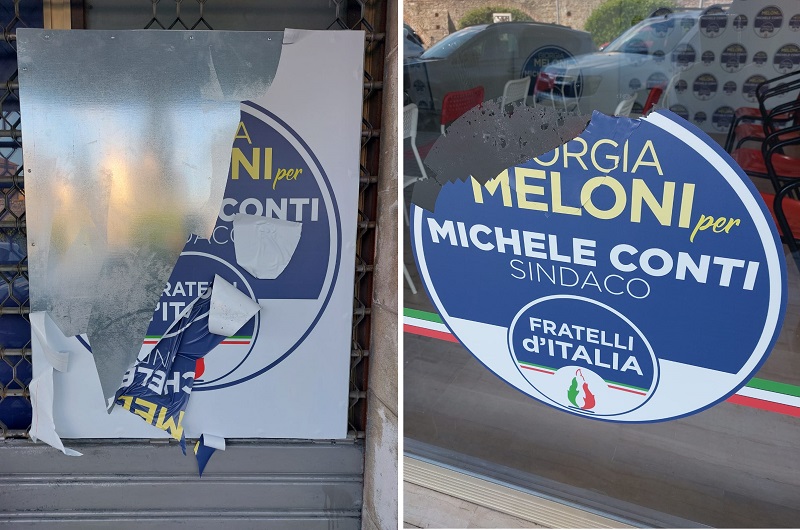 “A distanza di appena una settimana dall’inaugurazione, la sede del comitato elettorale di Fratelli d’Italia, in via Battelli n.3, a Pisa, è stata preso di mira dall’ignobile mano di vandali che hanno strappato dalle vetrate i simboli del partito. Certi che le forze dell’ordine identificheranno quanto prima i responsabili, ribadiamo che qualsiasi minaccia non farà diminuire il nostro impegno. Lasciamo che parlino le nostre idee, proposte, fatti con cui abbiamo migliorato e continueremo a migliorare e ammodernare la città di Pisa. Un’azione politica sempre nell’interesse dei pisani” dichiarano il Consigliere regionale di Fratelli d’Italia Diego Petrucci ed il coordinatore provinciale Marco Rusconi.