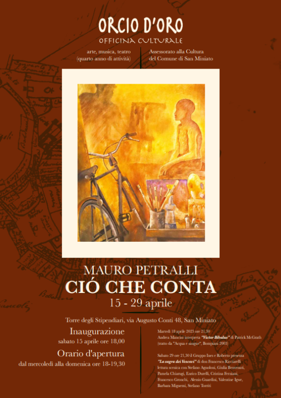 Da sabato 15 aprile alle ore 18 (apertura dal mercoledì alla domenica, ore 17,00-19,30), fino al 29 dello stesso mese, con il patrocinio dell’Assessorato alla Cultura del Comune di San Miniato, l’Orcio d’oro, via Augusto Conti 48, ospita Mauro Petralli con la mostra "Ciò che conta", a cura di Andrea Mancini, un evento importante, che conferma il percorso di questo che è ormai un punto di riferimento per l’arte contemporanea, nella nostra area, ma anche più in là, con interessi che si vanno consolidando in varie parti d’Italia e anche all’estero.