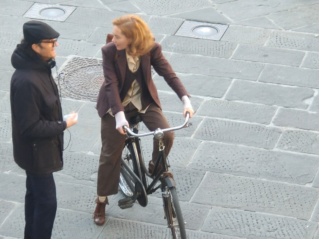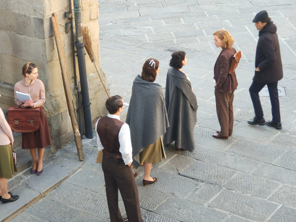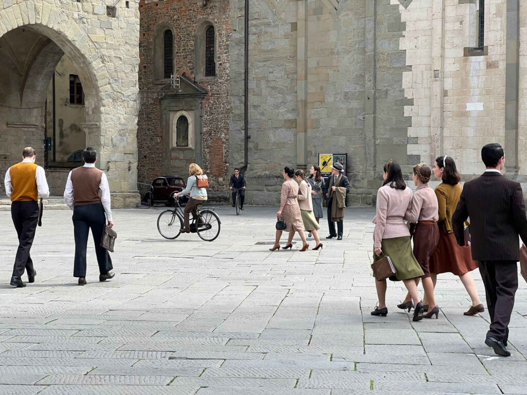 L’allestimento di piazza del Duomo è iniziato questa mattina verso le 6, quando sono arrivati alcuni elementi scenografici, tra i quali una carrozza trainata da un cavallo, macchine d’epoca, biciclette e un carrettino di gelati, insieme a molte comparse, vestite in abiti degli anni Quaranta. Agli attori e alla troupe non è mancato l’affetto di molti pistoiesi che, interessati e incuriositi, hanno seguito le telecamere accese sulla piazza.