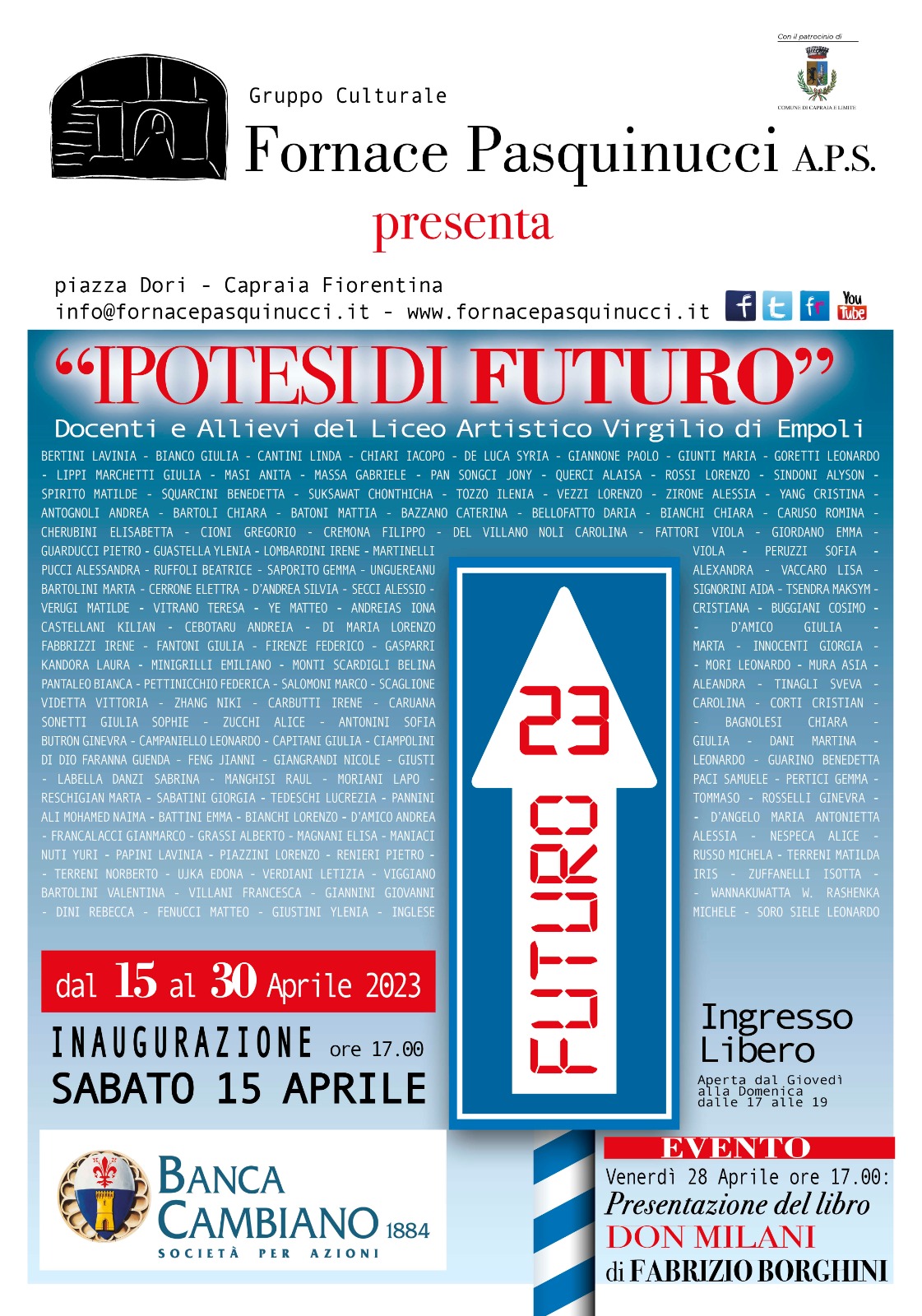 Sabato 15 Aprile alle 17, nei locali della ex Fornace Pasquinucci, Piazza Dori a Capraia Fiorentina, sarà inaugurata la mostra che ogni anno il Gruppo Culturale Fornace Pasquinucci riserva ai ragazzi del Liceo artistico il Virgilio di Empoli.