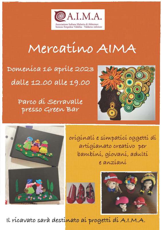 Il giorno successivo, domenica 16, è la volta del mercatino organizzato da A.I.M.A. L'appuntamento è al Green Bar nel verde del Parco di Serravalle. Come spiegato dalla sezione Empolese, presieduta da Maria Grazia Pasqualetti, il ricavato sarà interamente destinato alle attività di sostegno degli ammalati di Alzheimer e delle loro famiglie.
