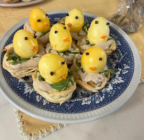 Adagiate le uova in una pentola e coprite con l’acqua fredda mettete in cucchiaino di aceto e cuocete per 8 minuti dal bollore. Passate poi sotto l’acqua fresca e sbucciatele delicatamente facendole rotolare in una base di legno. Prendete un piccolo contenitore e mettere 400 gr di acqua ed 1 cucchiaino di curcuma girare continuamente per 10 minuti a fuoco basso per non far bollire. Poi prendere un colino ed immergete un uovo per volta fino a farlo diventare del giallo che preferite. Nel frattempo prendete la pasta sfoglia ed adagiatela su una placca insieme alla sua carta da forno e con un coppa pasta del diametro di 7,5 cm o un bicchiere stesse dimensione, fate 6 cerchi utilizzando meno pasta possibile perché con quella rimanente farete tante strisce fini, aiutandovi con la rotella con cui si taglia la pizza, serviranno per girarle ad ognuna dei cerchi per rendere l’idea del nido. Spennellate ogni nido con del latte (se siete intollerante al lattosio potete sostituirlo con dell’olio evo). Bucate la superficie di ogni nido con una forchetta e mettete in forno statico a 180 gradi per 15 minuti. Mettete in un frullatore il tonno i capperi, le acciughe e frullate poi aggiungete la maionese e continuate a frullare. Appena pronti mettete il composto ottenuto in ogni nido, adagiare qualche fogliolina di rucola e cospargete con poco olio evo e poi prendete ogni singolo uovo e mettete 2 chiodi di garofano per fare gli occhi, tagliate una fetta di carota e dividerla a metà e poi ancora a metà con i 2/4 ottenuti fare un foro con il coltello ed inserirli all’intento dell’uovo per fare il becco poi mettete ogni uovo su ciascun nido servite e buon appetito.