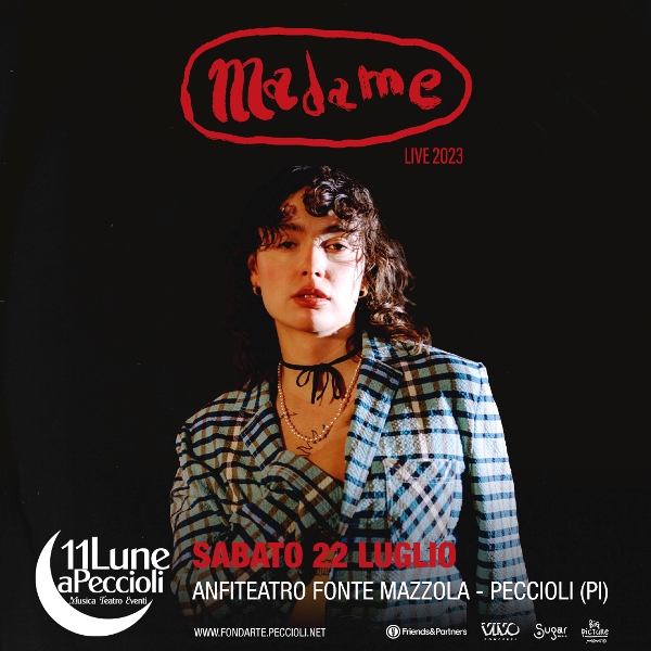 Sabato 22 luglio a distanza di qualche mese dall’uscita del suo secondo album, anticipato dal singolo già certificato platino e presentato a Sanremo 2023 "Il bene nel male" Madame, l’artista più ascoltata degli ultimi dieci anni (fonte Spotify) e che in soli quattro anni ha collezionato finora 35 certificazioni tra platino e oro, si esibirà a Peccioli.