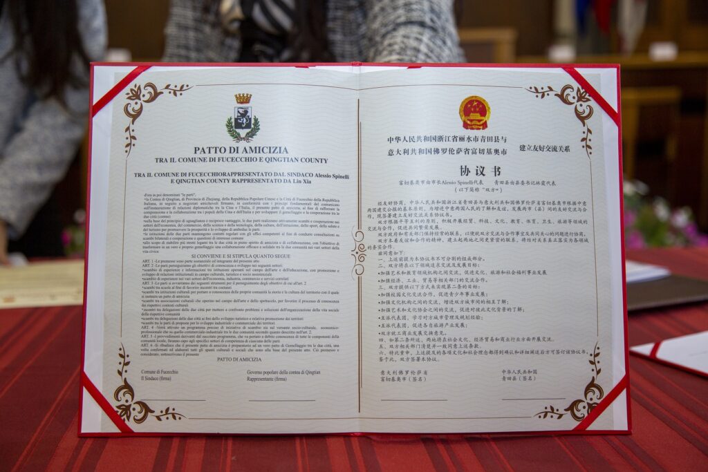 Con il Patto di Amicizia le due realtà si impegnano a perseguire obiettivi di conoscenza e sviluppo reciproci attraverso lo scambio di esperienze in campo culturale, turistico, socio-assistenziale ed economico, che sarà realizzato attraverso incontri tra delegazioni delle due città, scambi culturali tra scuole, associazioni e istituzioni e scambi di proposte per lo sviluppo dei due territori. Una vicinanza che già si era manifestata durante il periodo della pandemia quando la comunità cinese di Fucecchio e dintorni si distinse per una serie di donazioni, sia economiche che di materiale sanitario, sia alle comunità locali che agli ospedali della zona.