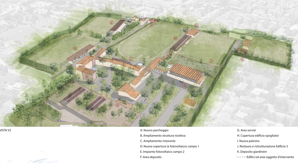 Attuali Spogliatoi e Palestra. Le strutture che ospitano spogliatoi principali e palestra, lateralmente al campo 3 “Vittorio Pozzo” (al termine dei lavori queste aree saranno integrate nell’ex Auditorium), subiranno una manutenzione straordinaria e un adeguamento funzionale. Lo spogliatoio sarà interessato da interventi di manutenzione straordinaria e adeguamento funzionale e verrà integrato con una nuova copertura (940 mq) tale da rendere fruibile la terrazza. Verrà realizzato un nuovo edificio di servizio (spazio polivalente) alla palestra di 230 mq circa, in aderenza all’edificio esistente sul lato est e su quello prospiciente viale G. Verga, dal quale si prevede un nuovo ingresso, funzionale ad ospitare punto ristoro, servizi igienici, piccolo deposito. Tra l’altro questo ingresso sarebbe adiacente al futuro tracciato della tramvia, così da permettere di raggiungere il CTF con mezzi pubblici. Un secondo ingresso, di fianco a quello del Museo del Calcio, permetterà̀ un diretto accesso al Campo 2 in occasione di partite amichevoli.