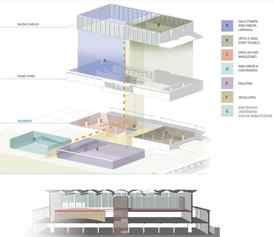 Ristrutturazione PALESTRA GRANDE e aree limitrofe. L’edificio, classificato "di interesse documentale del moderno", sarà oggetto di un accurato intervento di restauro e di un contestuale miglioramento delle prestazioni energetiche. Diventerà il cardine delle operazioni sportive nel Centro: al suo interno nasceranno una seri di spazi per le squadre, per le attività media e per il lavoro quotidiano degli staff tecnici e dirigenziali su più livelli. Nel piano seminterrato le aree per spogliatoi, gli studi medici e il magazzino per l’abbigliamento tecnico; al piano terra l’area ricerca, quella per il lavoro dei Media e gli studi TV; al 1° piano gli uffici per gli staff tecnici delle Nazionali e per le diverse unità federali che seguono le squadre, oltre ad una sala conferenze.