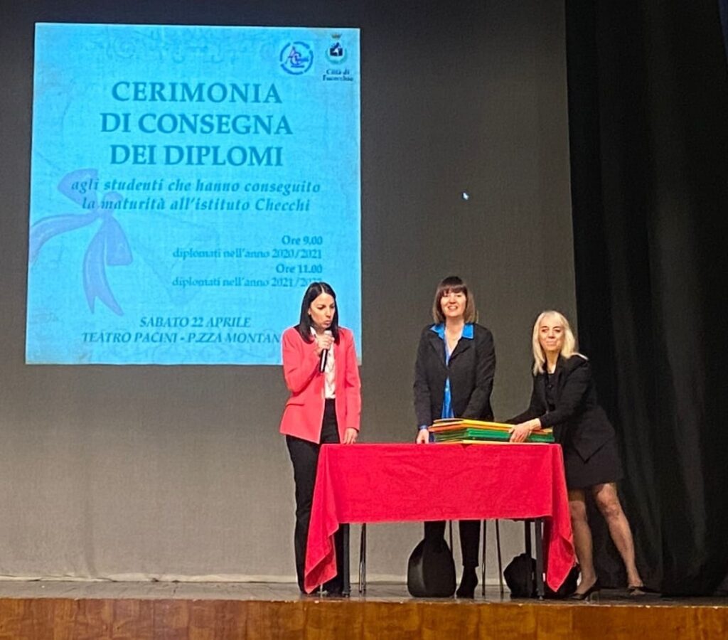 Una cerimonia toccante e molto sentita quella che si è svolta sabato scorso al Teatro Pacini di Fucecchio in occasione della consegna dei diplomi agli studenti dell'istituto superiore “Arturo Checchi” che hanno conseguito la maturità negli anni scolastici 2020/2021 e 2021/2022. Ad accogliere i diplomati sono state la dirigente scolastica Genny Pellitteri, la professoressa Nella Frediani, collaboratrice della dirigente, e la vice sindaca Emma Donnini, che hanno voluto omaggiare la professoressa Daniela Mancini, ex dirigente dell'istituto, alla quale si deve l'istituzione di questa iniziativa. Durante la mattina tutti gli ex studenti ed ex studentesse dell'istituto sono saliti sul palco del Teatro Pacini per ricevere il proprio attestato, segno tangibile della fine di un percorso che segna al contempo l'inizio di una nuova fase della loro vita.