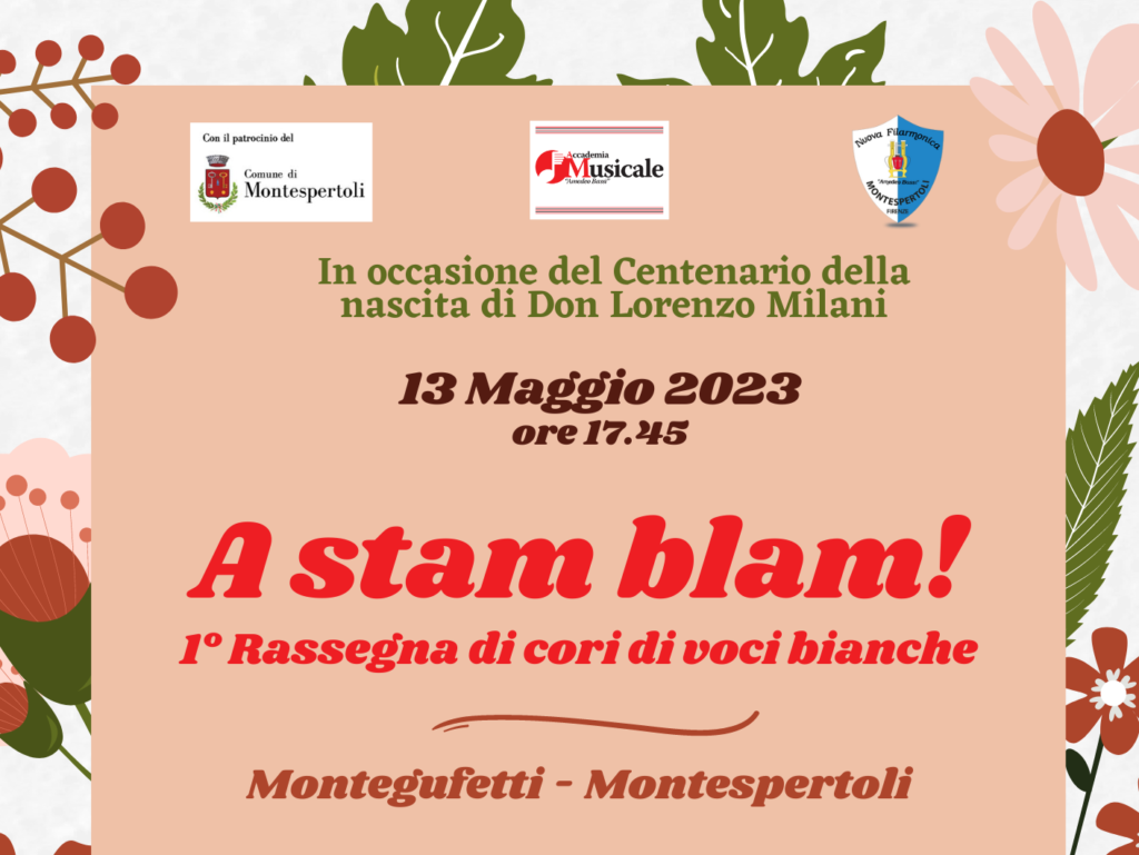 Sulla scia di questa magia, “A Stam Blam!” è la prima rassegna di cori di voci bianche patrocinata dal Comune di Montespertoli e organizzata dall’Accademia Musicale “Amedeo Bassi”, prevista per il pomeriggio di sabato 13 maggio alle ore 17:45, presso la Sala Topical della Casa del popolo ARCI di Montespertoli. Oltre ai Montegufetti, il coro dei bambini della stessa accademia, diretto da Melania Minacci, interverranno il Coro di voci bianche dell’Istituto Comprensivo Montanelli-Petrarca di Fucecchio diretto da Massimo Annibali e il Coro Voci Bianche Colli Fiorentini diretto da Silvia Lotti. Il pomeriggio di musica vedrà anche la partecipazione straordinaria dell’Orchestra “Amedeo Bassi”. Tre cori dunque, oltre 60 bambini uniti da un’unica passione, tante energie attraverseranno il palco della Sala Topical, in nome di Don Milani.Il concerto apre infatti le celebrazioni che l’Amministrazione Comunale ha promosso in occasione del Centenario della nascita di Don Milani. L’appuntamento è dunque per sabato 13 maggio alle ore 17.45, l’ingresso è libero e non è necessaria la prenotazione.