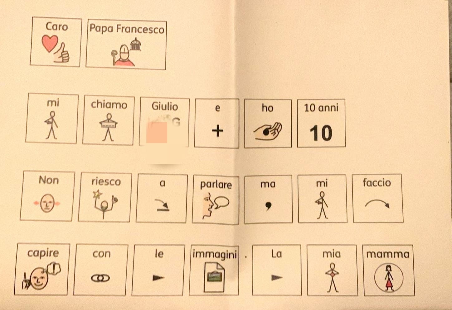Caro Papa Francesco, mi chiamo Giulio…Anche senza le parole, anche senza usare la voce, con i simboli, i segni, le immagini della Comunicazione aumentativa alternativa, si può dialogare e arrivare ovunque. Fino al Santo Padre. Il piccolo Giulio, un bambino di Barberino Tavarnelle di dieci anni con difficoltà nell’uso del linguaggio, scrive una lettera a Papa Francesco usando i simboli della CAA, un approccio alternativo, caratterizzato da strategie, strumenti e tecniche che offrono a persone con bisogni comunicativi complessi la possibilità di comunicare e farsi capire.