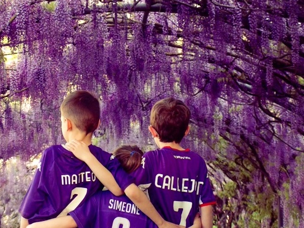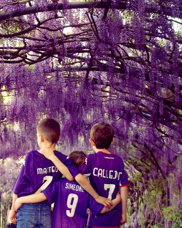 Tre bambini si abbracciano sotto la pergola del glicine di Villa Bardini e il viola della maglia della loro squadra, la Fiorentina, dialoga con il viola del fiore.