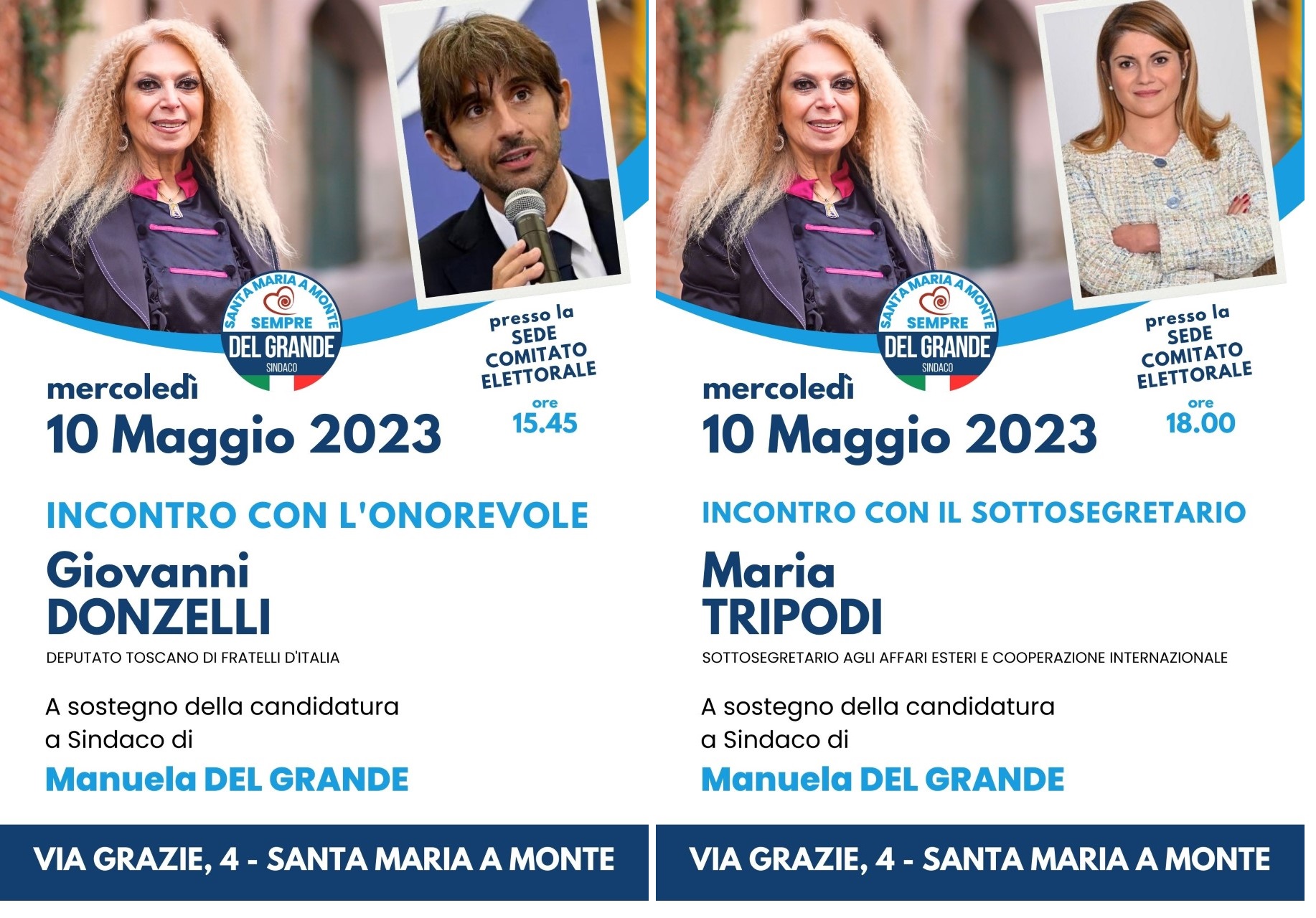 Il deputato Donzelli sarà in città alle ore 15.45 presso la sede del comitato elettorale, in via Grazie 4, mentre Maria Tripodi, sottosegretario agli Affari Esteri e alla Cooperazione internazionale, sarà a Santa Maria a Monte alle ore 18, sempre presso la sede del comitato.