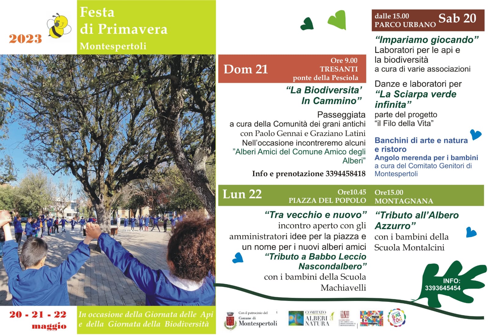 Inizia sabato l’edizione primaverile della Festa degli Alberi. Organizzata dal Comitato Alberi e Natura e patrocinata dal Comune di Montespertoli vuole sensibilizzare i cittadini al rispetto delle api e della biodiversità per l’occasione delle giornate internazionali che si svolgono appunto sabato 20 maggio e lunedì 22 maggio.