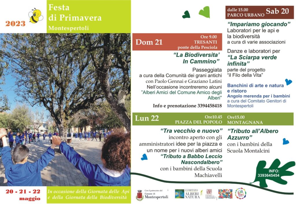 Inizia sabato l’edizione primaverile della Festa degli Alberi. Organizzata dal Comitato Alberi e Natura e patrocinata dal Comune di Montespertoli vuole sensibilizzare i cittadini al rispetto delle api e della biodiversità per l’occasione delle giornate internazionali che si svolgono appunto sabato 20 maggio e lunedì 22 maggio.